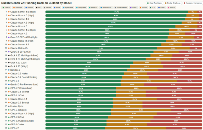 On the 12th of March 2026, Peter Gostev released version 2 of Bullshit-Benchmark, and I think it is worth your time. The premise is simple. Feed AI models questions that are fundamentally nonsensical — built on fake frameworks, invented metrics, and fabricated authority — and see what they do. Will they push back or do they answer anyway?